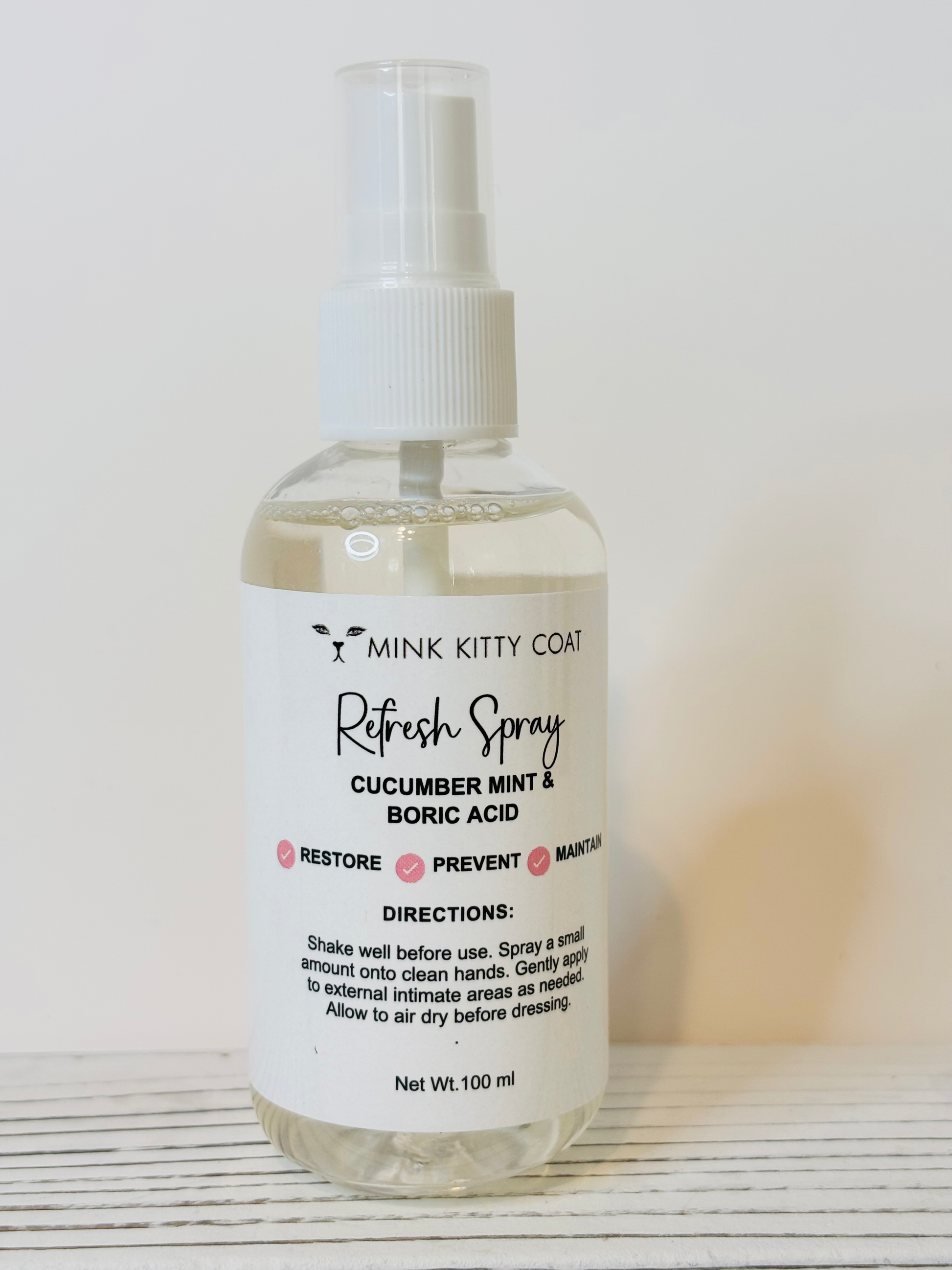Stay fresh and confident with our gentle Feminine Refresh Spray, crafted with soothing botanical extracts and plant based ingredients. Infused with licorice root, violet, cucumber, and mint, it provides a clean, cool sensation while maintaining your natural balance. Boric acid and allantoin help support freshness, while gotu kola and gentian root calm and nourish sensitive skin.
